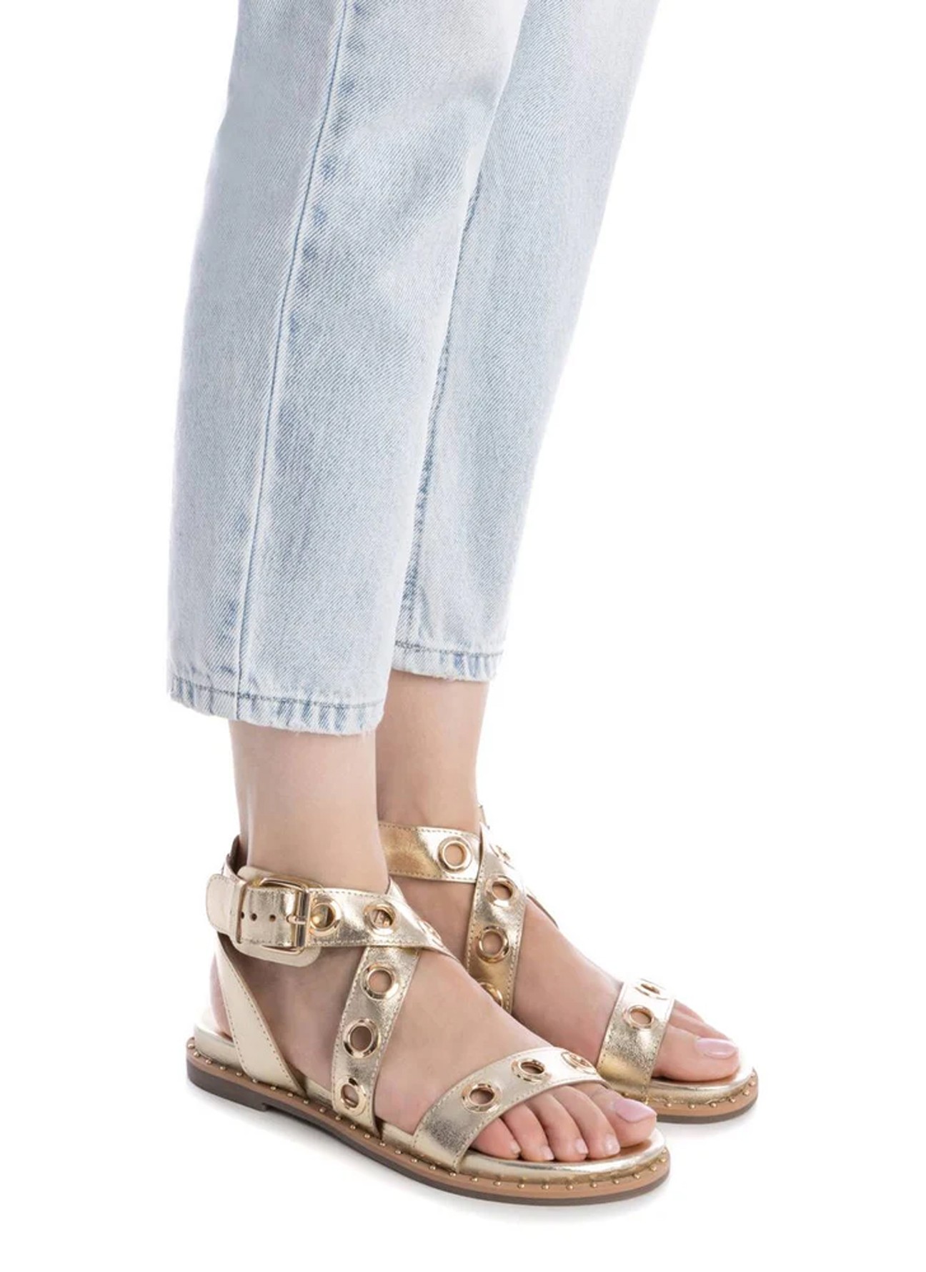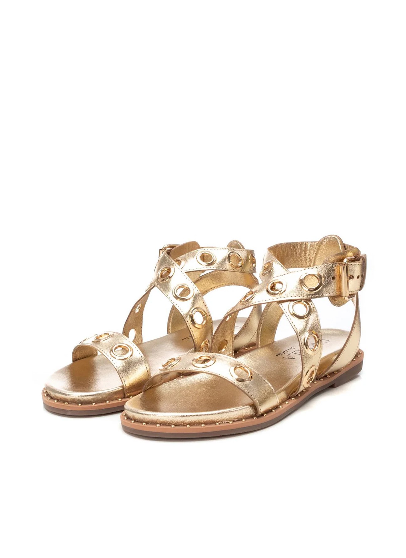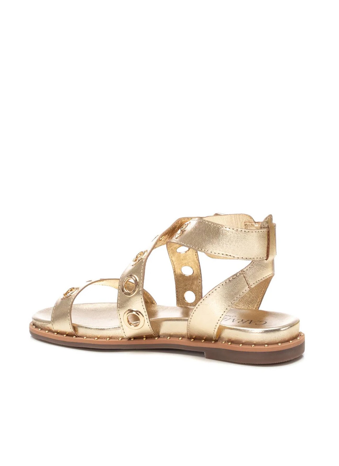 Las sandalias **Carmela modelo 16238902** combinan elegancia y carácter en un diseño metalizado dorado que aporta luz y sofisticación a cualquier look. Sus tiras decoradas con ojales metálicos refuerzan su estilo moderno y femenino, convirtiéndolas en el complemento perfecto tanto para vestidos fluidos como para jeans o estilismos más arreglados.