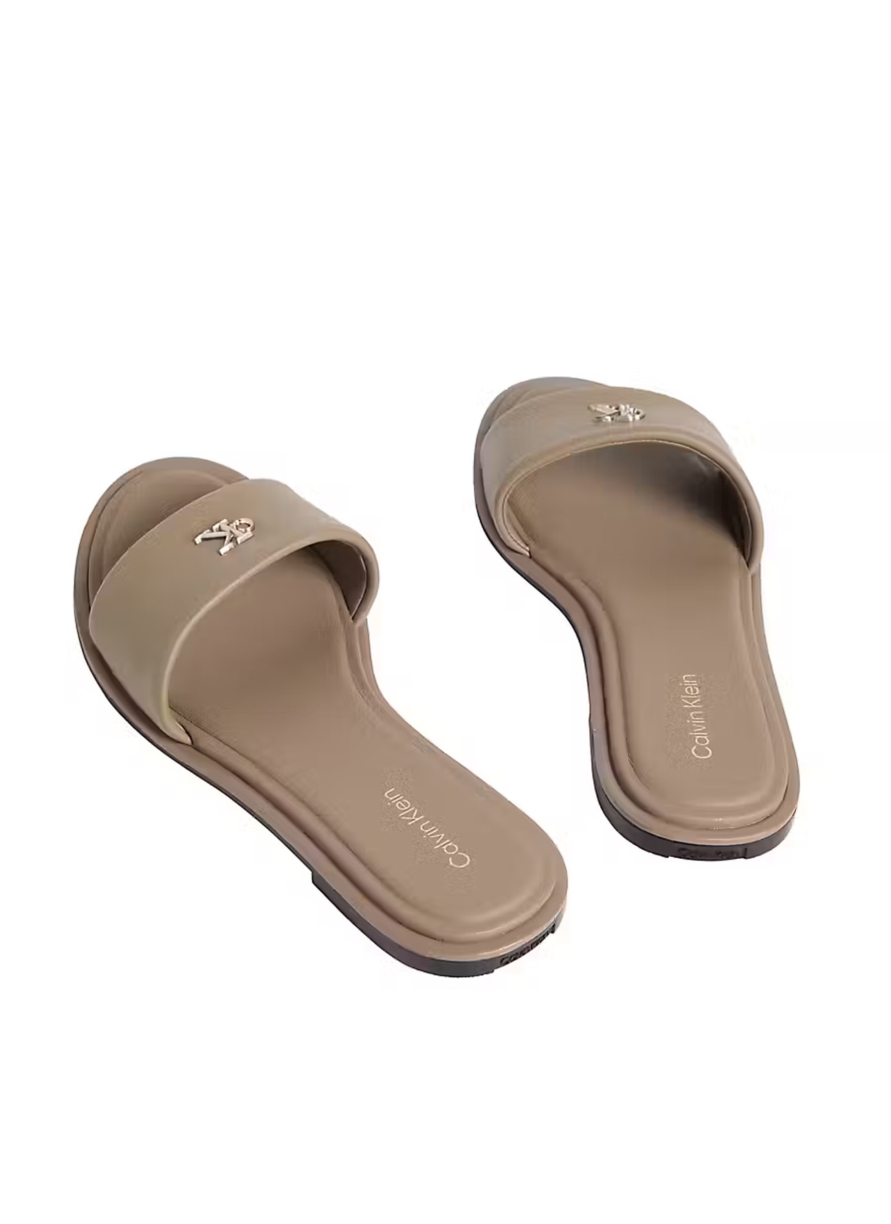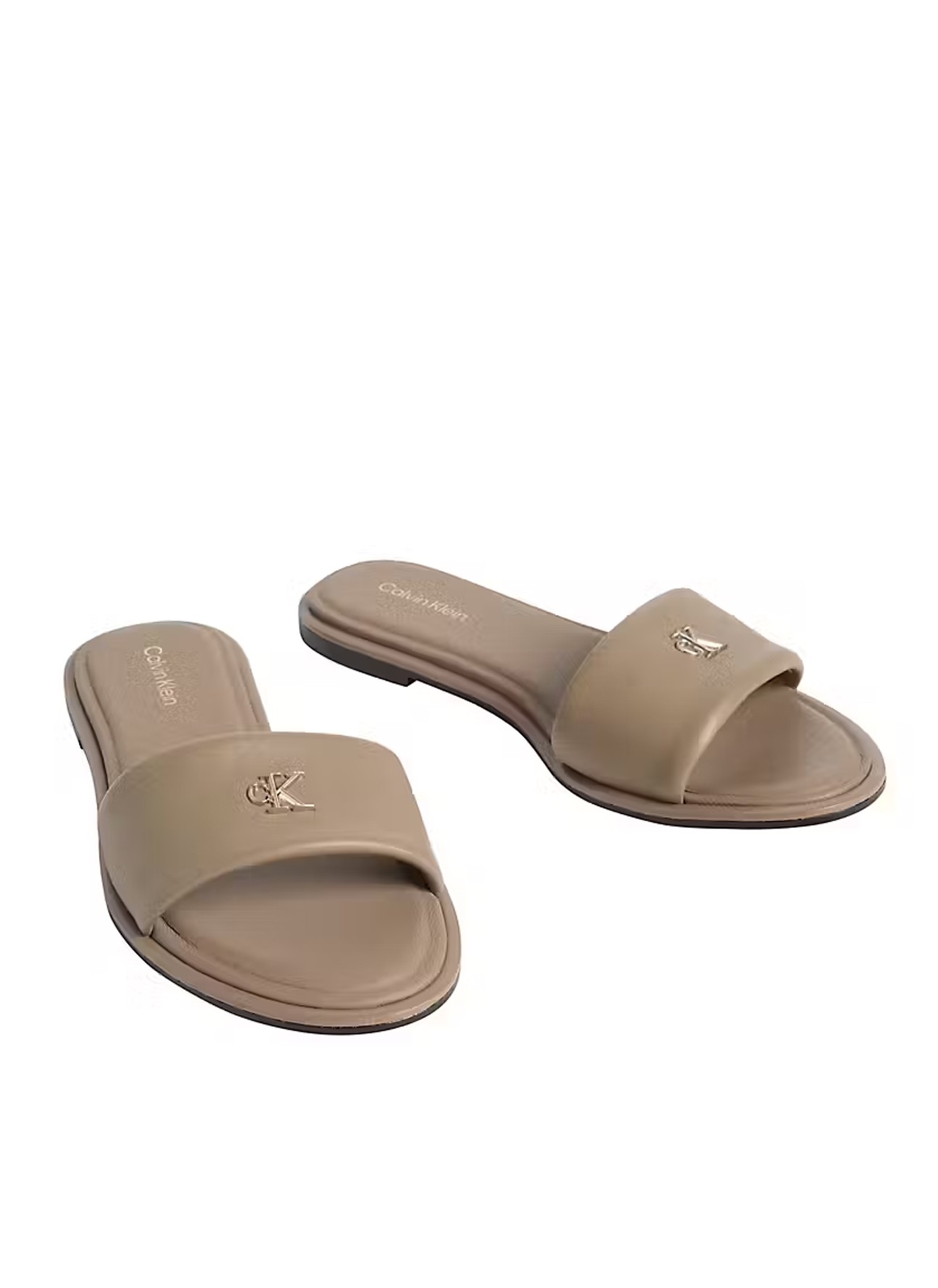 Le modèle présente une large lanière en cuir lisse sur le dessus ornée du monogramme métallique CK, un détail discret qui apporte une identité à la pièce. Le design de type slide permet de les chausser facilement et renforce leur caractère pratique pour un usage quotidien.