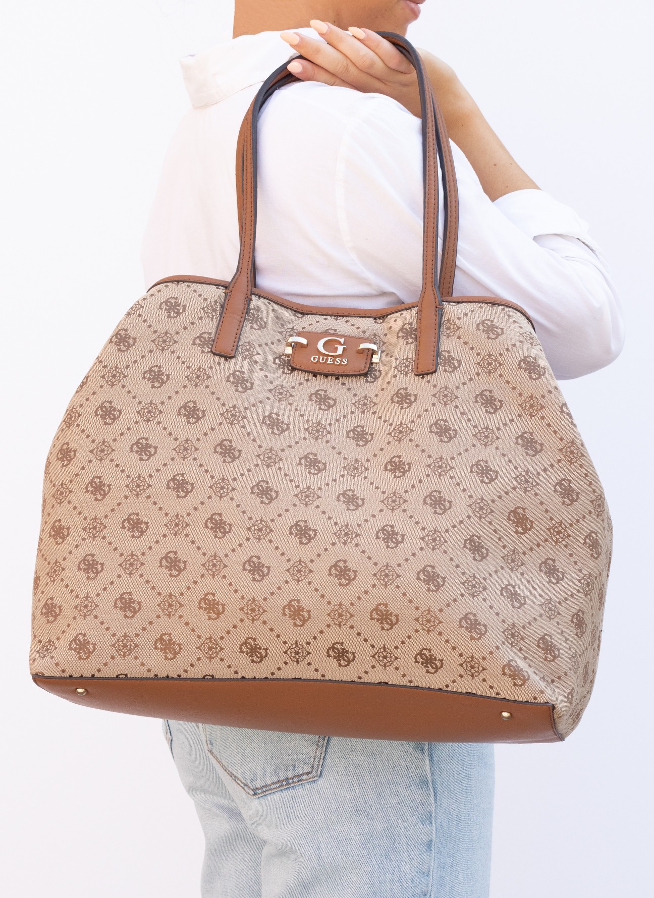 Versatilidad y estilo en un solo bolso. El Bolso GUESS Neda Large 2 In 1 Tote camel es la opción perfecta para quienes buscan un diseño moderno, funcional y elegante. Su sistema 2 en 1 permite usarlo como tote amplio o como bolso más compacto, adaptándose a todas tus necesidades diarias.