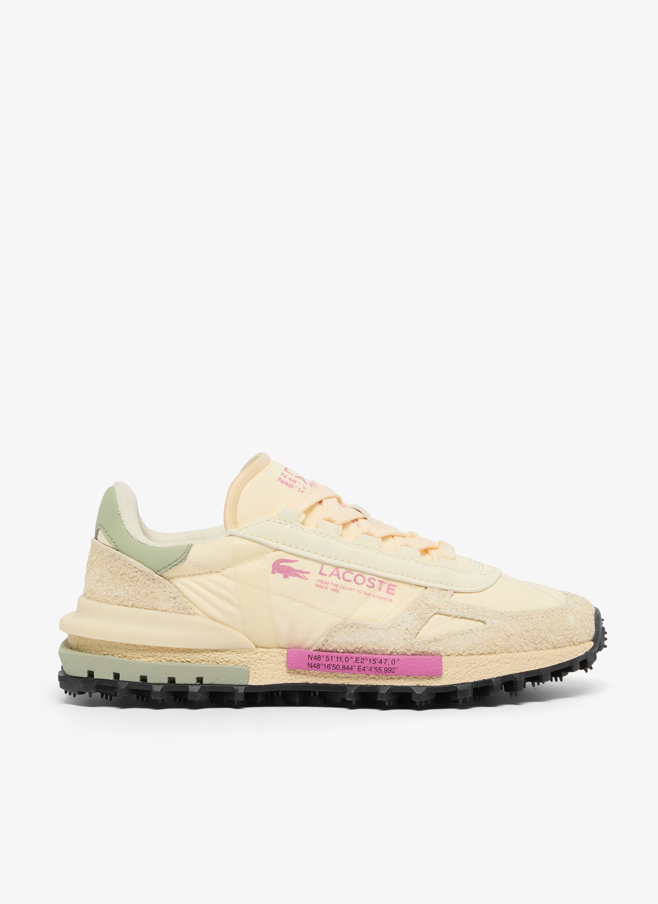 El modelo Elite Active de Lacoste combina la esencia del running clásico con una actitud contemporánea y urbana. Esta versión en tono crema suave incorpora acentos en rosa vibrante y verde salvia que aportan un contraste fresco y actual. El upper mezcla tejido técnico acolchado con refuerzos de ante en puntera y talón, generando una silueta rica en texturas y con mayor resistencia en las zonas clave.