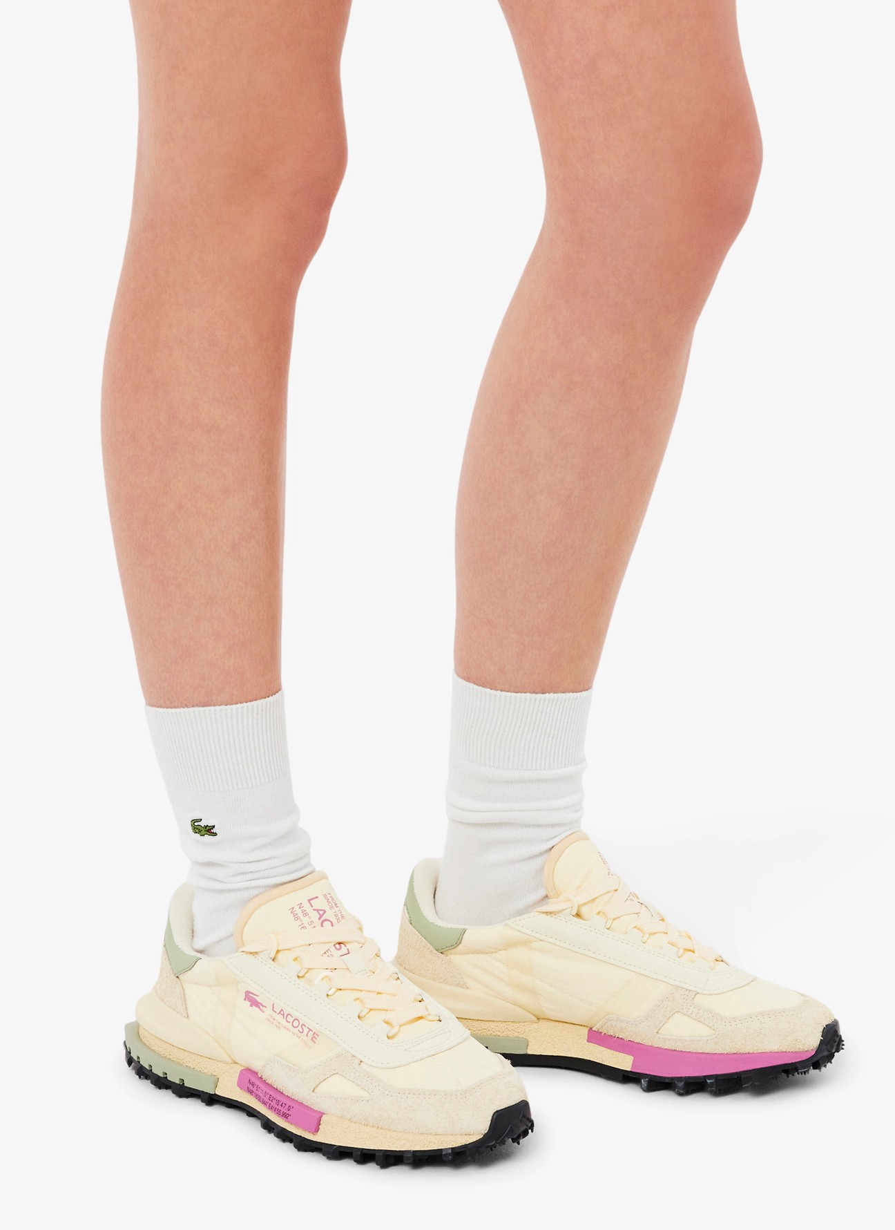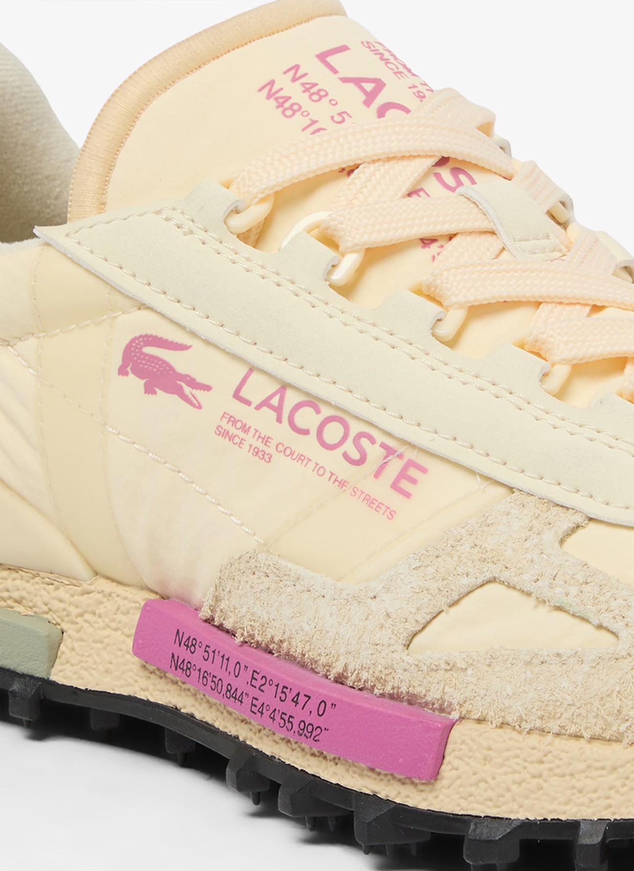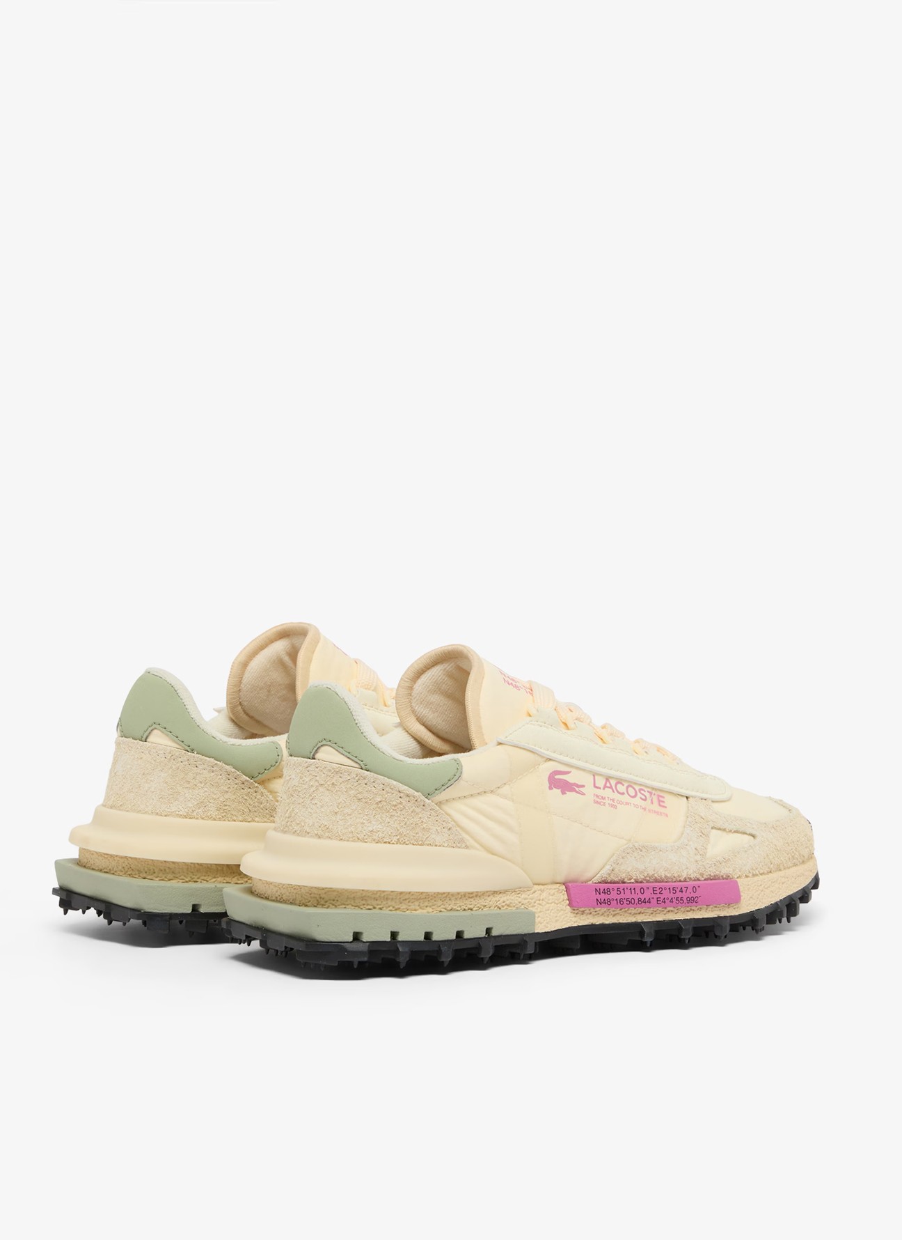El logotipo Lacoste en rosa en el lateral refuerza la identidad de la marca, mientras que los detalles gráficos en la mediasuela aportan un toque distintivo y moderno. La mediasuela estructurada ofrece una amortiguación cómoda y estable para el uso diario, y la suela exterior con tacos marcados en negro proporciona una tracción firme, acentuando su inspiración outdoor y su carácter dinámico.