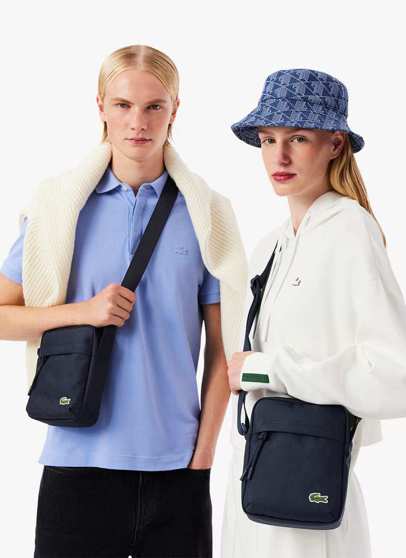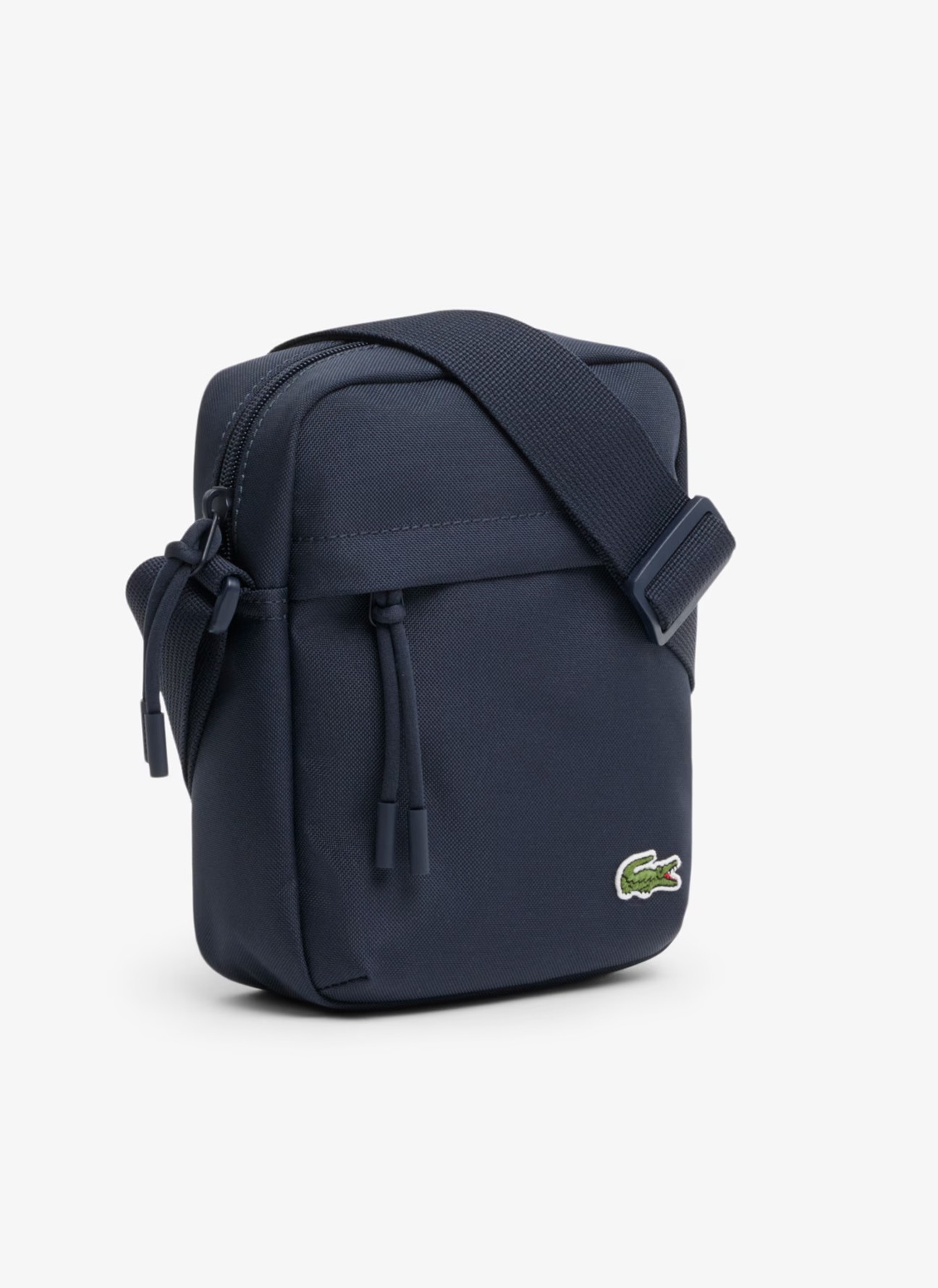 Confeccionada en tejido reciclado resistente, presenta unas dimensiones de 16,5 × 21 × 7 cm (6,3 × 8,3 × 2,4”), ofreciendo el espacio ideal para llevar tus esenciales bien organizados. Incorpora un bolsillo exterior de fácil acceso y un bolsillo interior de malla que facilita la distribución del contenido. Su correa ajustable, de 75 a 140 cm (29,5”-55”), permite llevarla cruzada tipo bandolera y disfrutar de total libertad de movimiento. El diseño se completa con el emblemático cocodrilo en la parte delantera, sello distintivo de la marca.