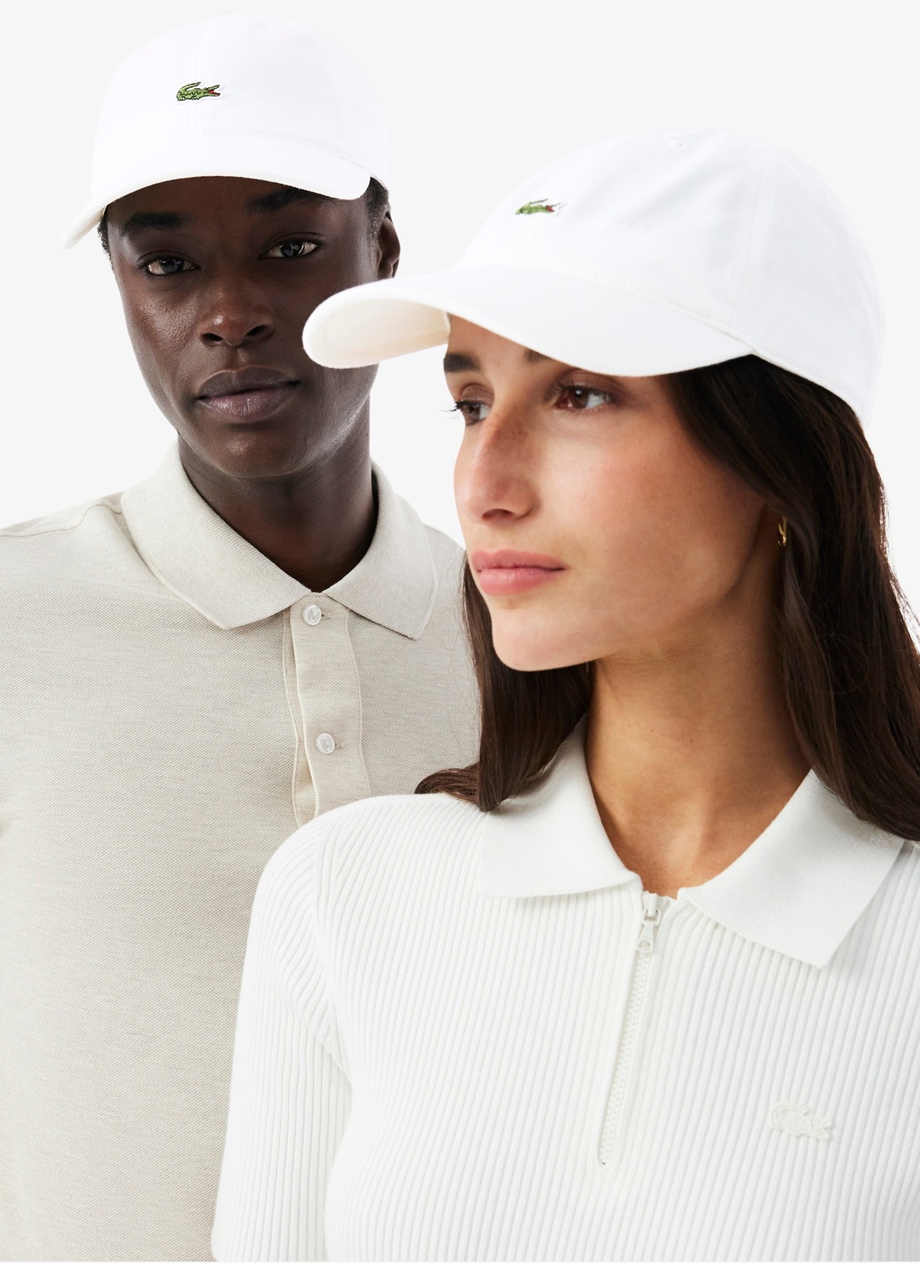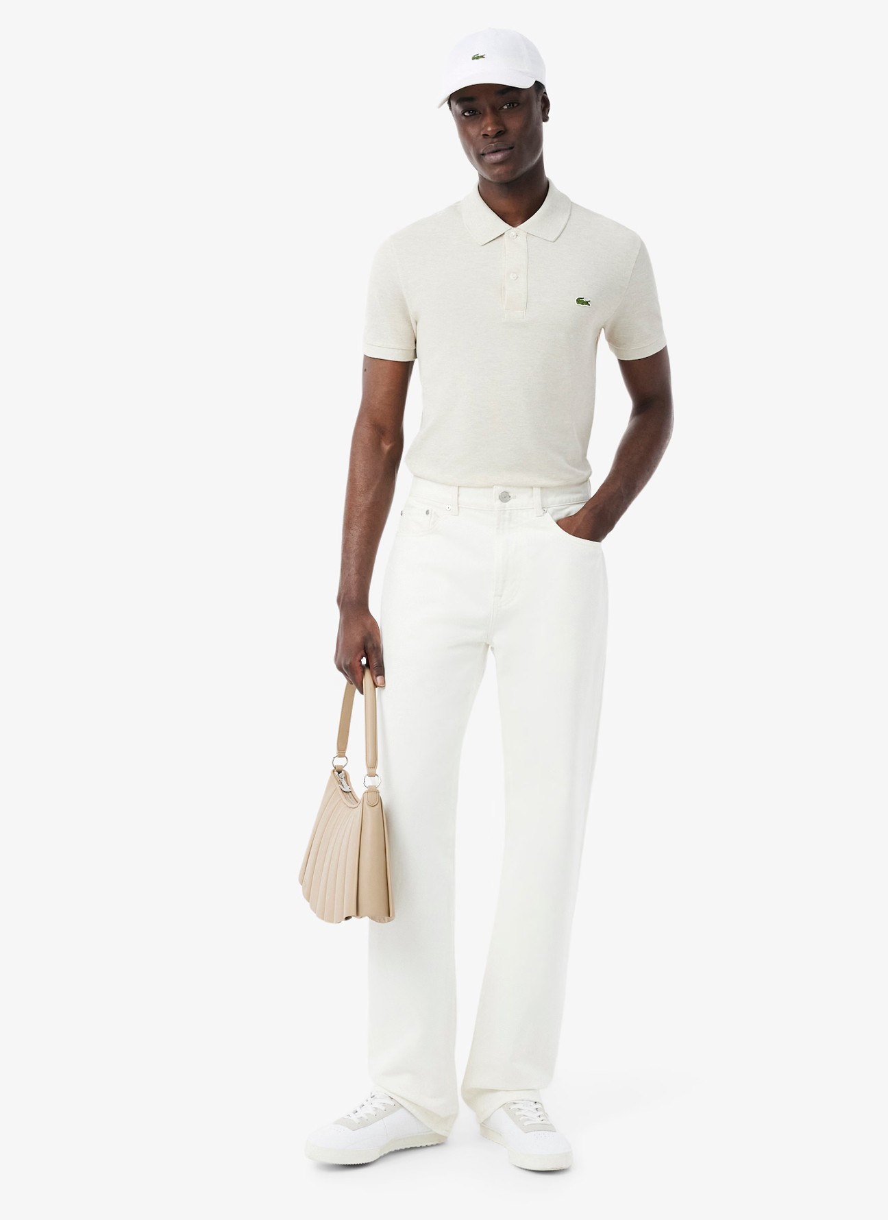 Presenta una silueta clásica de seis paneles con visera curvada y una correa ajustable en la parte posterior con hebilla metálica, adornada con una discreta raya de espiga y cinta con la marca que refuerzan su identidad. El icónico cocodrilo bordado en la parte delantera firma el diseño con el sello distintivo de la casa.