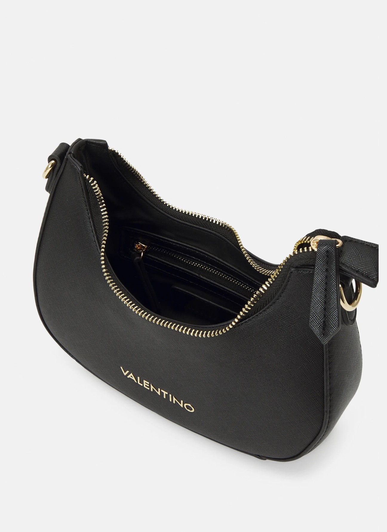 Cuenta con cierre superior de cremallera metálica que garantiza seguridad y comodidad, mientras que su interior amplio incorpora un práctico bolsillo con cremallera para mantener organizados tus esenciales. En el frontal destaca el logotipo Valentino en acabado dorado, en armonía con los herrajes metálicos que elevan el diseño.