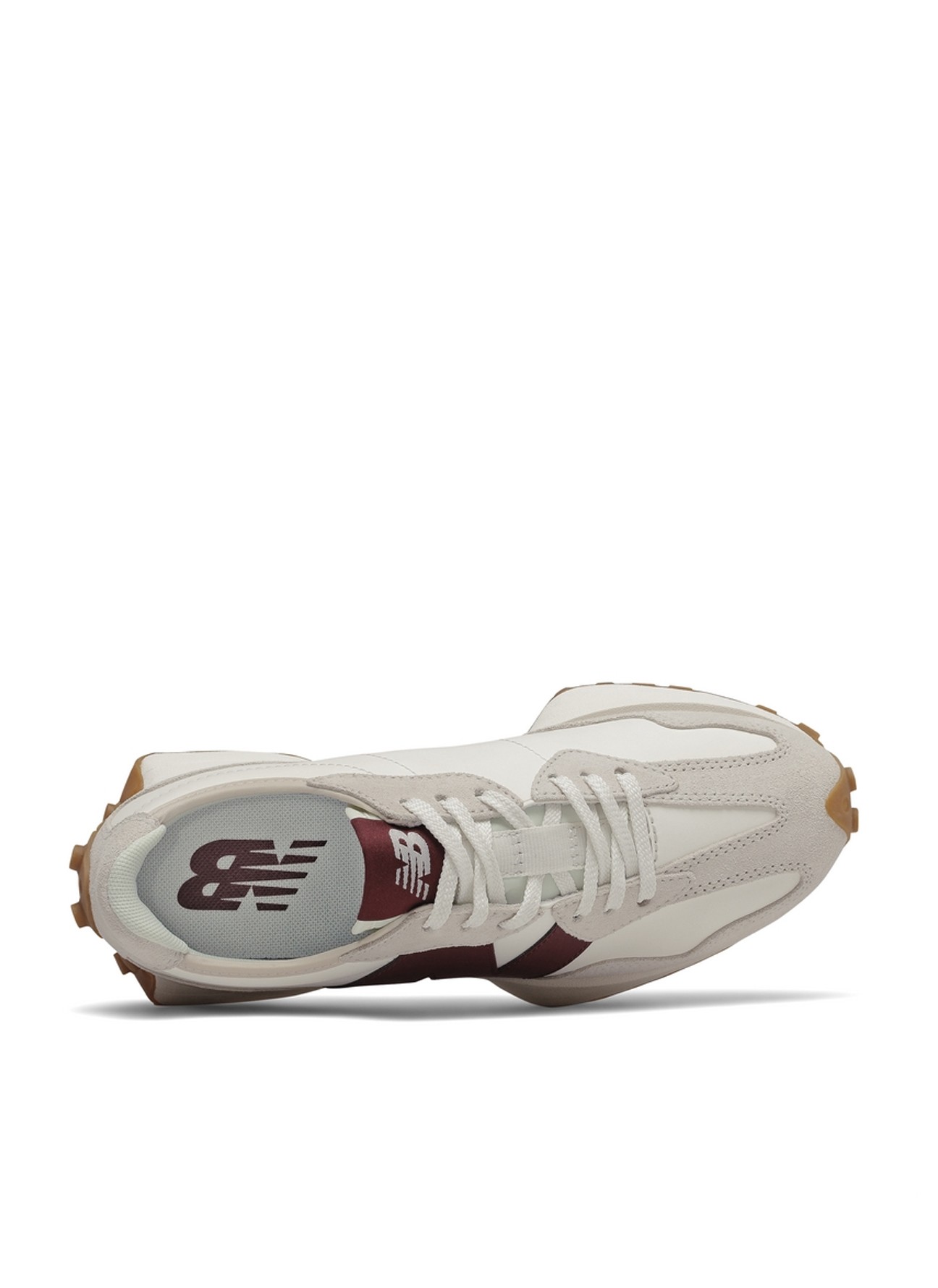 El modelo WS327 de New Balance reinterpreta el estilo running de los años 70 con una silueta moderna y llamativa. Presenta una combinación en tonos beige y blanco roto con el icónico logo “N” en color burdeos de gran tamaño, creando un contraste elegante y actual.